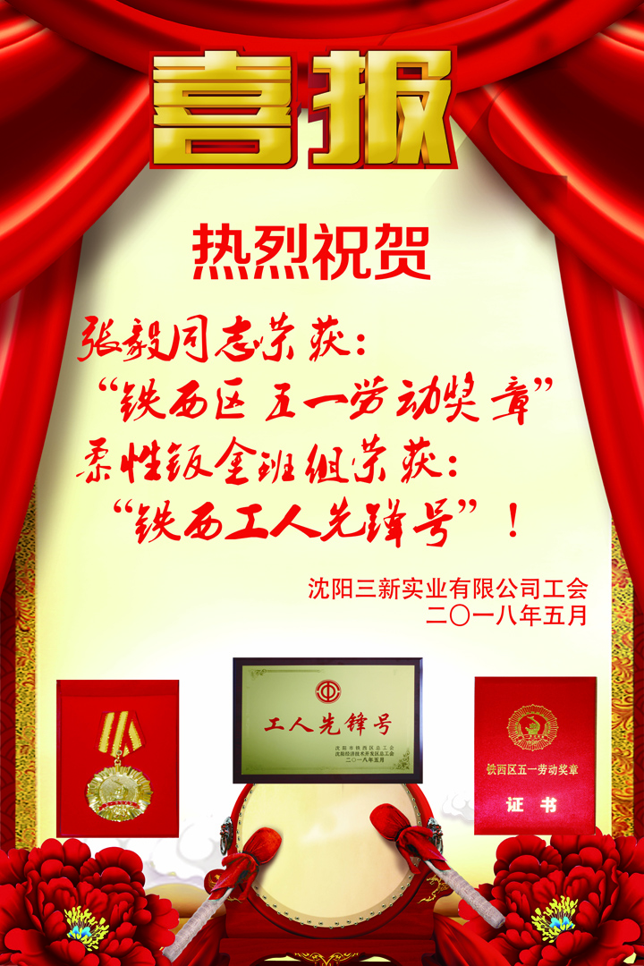 沈陽三新實業(yè)有限公司榮獲“鐵西五一勞動獎狀”,張毅同志榮獲“鐵西區(qū)五一勞動獎?wù)隆?,柔性鈑金班組于永欣等9名同志榮獲“鐵西工人先鋒號”!